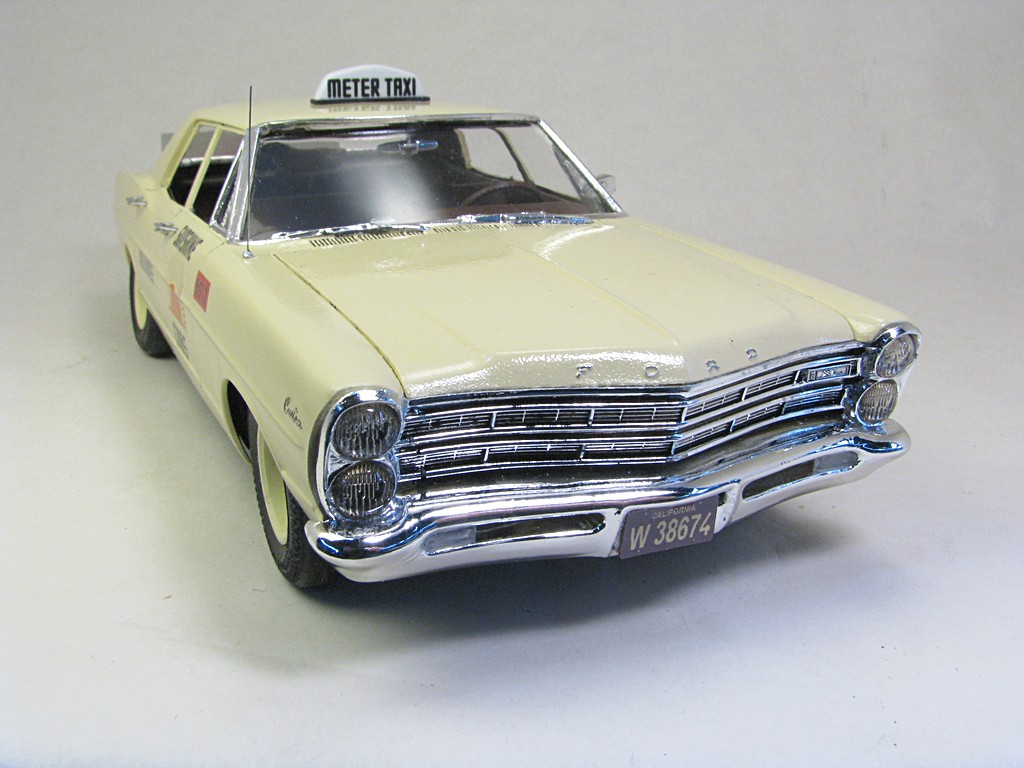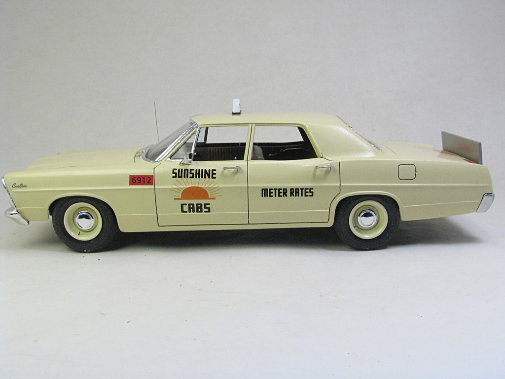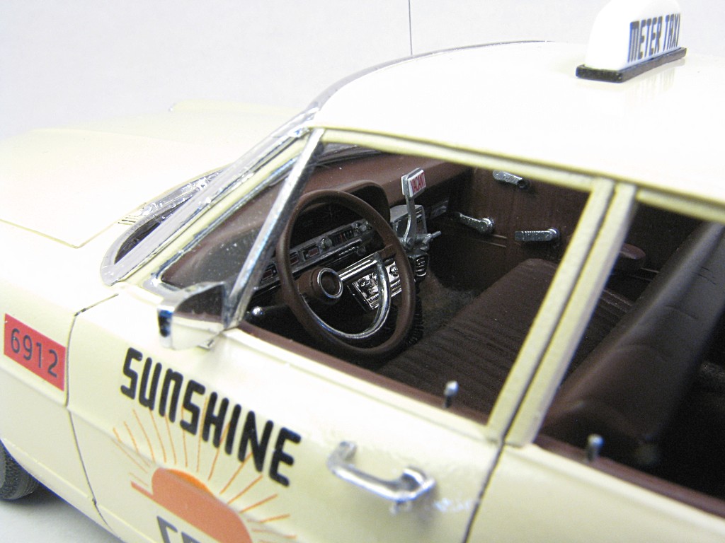 | 1967 Ford Custom 500 taxi (Bullitt movie) This is another addition to the collection of the 'Cars of the movie Bullitt', which was released in 1968. The late Robert Duvall was the taxi driver of this car as he drove Steve McQueen around to various locations in San Francisco. This model grafted the roof of an AMT Ford Interceptor Police Car kit (a 1970 Ford Galaxie 500) onto the body of an AMT Ford Galaxie convertible. The actual car in the movie was a Ford Custom 500, which was sold as fleet vehicles to police departments, taxi compnanies, etc. It differs from the Ford Galaxie in having fewer chrome moldings and a simpler interior. Base Kit(s): AMT 1967 Ford Galaxie (kit number 6117-200) Finished: April 2026 Modifications/Additions: - added roof from Ford Police Car kit and reshaped rear window - rescribed door panel lines to change into a four door - aftermarket window cranks and interior door handles - scratchbult one interior door handle and then resin cast 3 copies - added interior door locks - modified 1:35 scale 3D printed dog for rear window shelf, as per the movie car - BestModelCarParts gauges - added turn signal stalk and gear shifter - scratchbuilt taxi meter with VACANT flag - flocked interior floor - modified police car radio with wound wire for the microphone - modified bench seats from Ford Police car kit - narrowed, headrest and roll pattern removed - custom license plate and bumper sticker to match movie car - rear part of front bumper opened up and running lights added in openeing - headlights from Czech Model Truck Model (https://www.czechtruckmodel.com/) - added radio anttenna - exterior rear view mirror from parts box - scratchbuilt taxi light on roof - exterior door handles from Canuck3D (https://canuck3d.ca/) - photoetch "Custom" script on front quarter panel - scratchbuilt rear advertising sign frame and advertisement taken from billboard photo found on the internet - rear bumper section was removed and strip styrene added to trunk - removed trim on rocker panels - custom printed license plate - all decals from Precision Design Co. (https://www.pdc.ca/rr/catalog) - interior paint is Tamiya acrylic red brown, followed by semi-gloss clear - grill and panel lines have a Tamiya panel line accent black wash - exterior crhome trim is a combination of bare metal foil and Molotow chrome - body paint is Testors Phoenecion yellow, decanted and airbrushed, followed by 1K clear, with some sections polished Click on Thumbnail to see detailed image. These images are 1024 x 768 and maybe a bit slow to load, depending on your connection speed. |