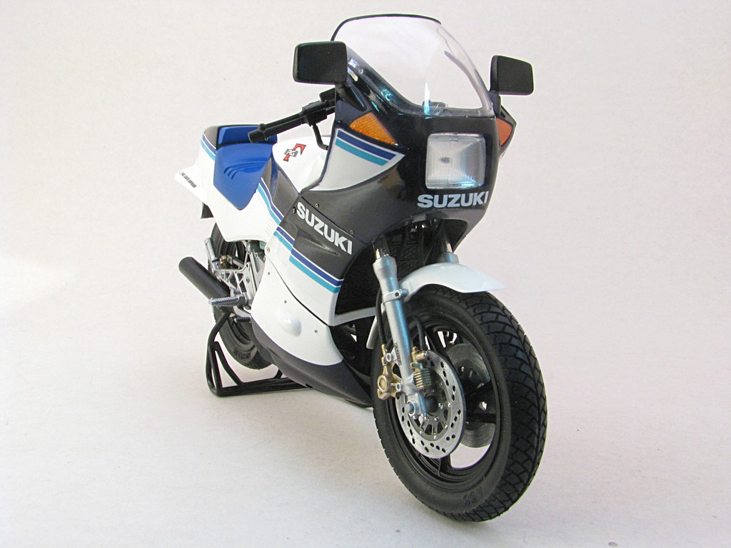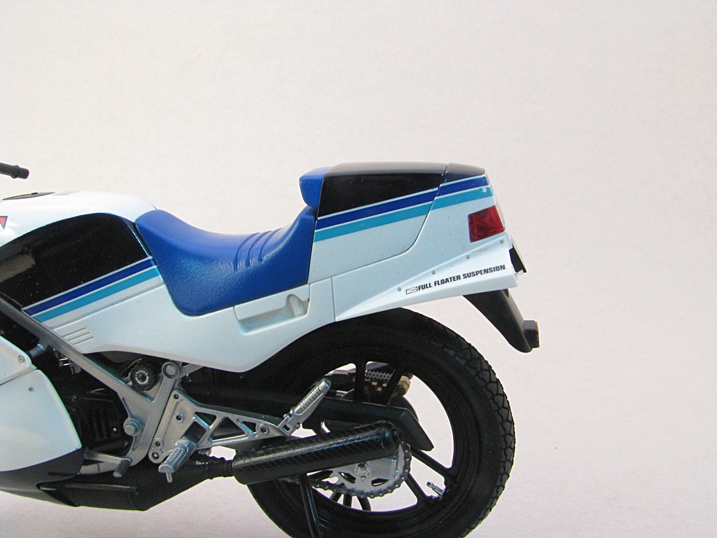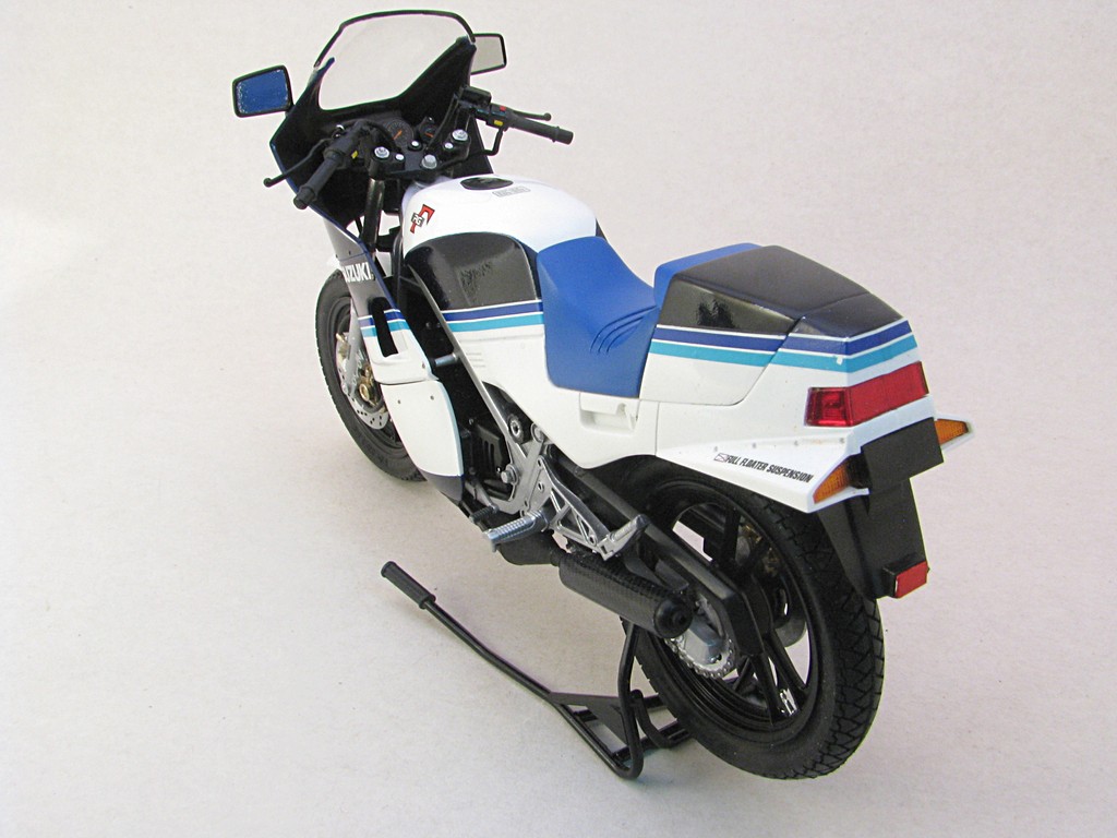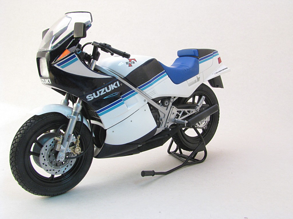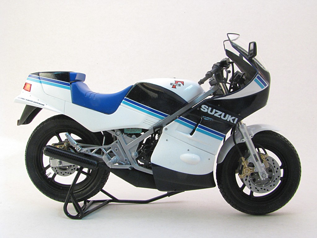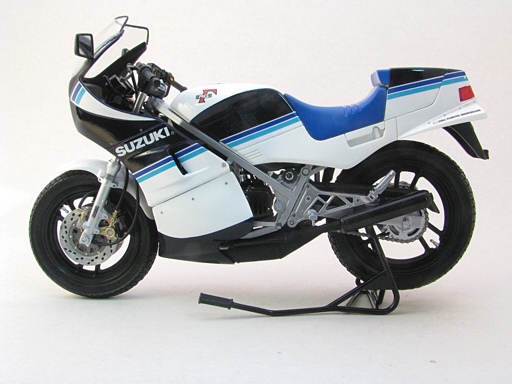 | Suzuki RG250 (smaller fairing) This was a fairly quick build to help round out my collection of Suzuki RG250 motorcycle models. I've always liked the triple blue striping that is quite common with Suzuki motorcycles. Base Kit(s): Tamiya Suzuki RG250 Gamma (kit number 14024) Finished: Mar 2021 Modifications/Additions: - the rear bodywork has the option of a passenger seat or full cover - Tamiya carbon fiber decal used on muffler - Paint is Tamiya TS26 pure white, TS55 dark blue, all decanted and airbrushed Click on Thumbnail to see detailed image. These images are 1024 x 768 and should load reasonably quickly, depending on your connection speed. |