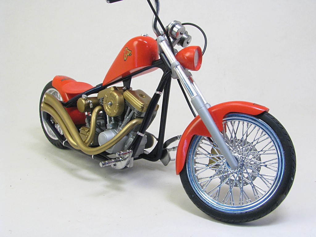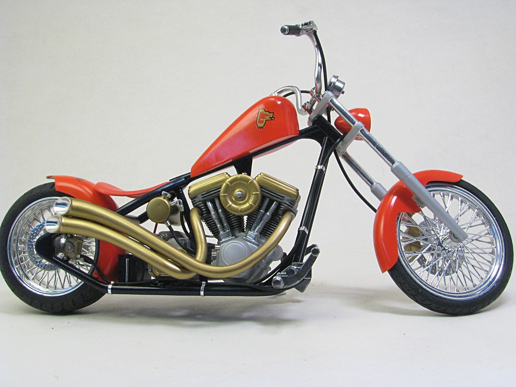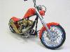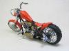 | Walter Wolf Chopper This model started as a built up kit that was given to me at the 2026 Motorcycle Supershow. The idea was to disassemble, strip the paint and rebuild the model during the 2026 24 hour build challenge. Alas, the model was not completed by the 24 hour deadline and the Testor's Chrom Spray paint, that was airbrished, needed to be stripped and done with Alclad chrome. Base Kit(s): Revell-Monogram "Crusader" chopper (kit number 7314) Finished: February 2026 Modifications/Additions: - control cables (clutch and brakes) and gear shift rod - battery wiring - oil lines - spark plugs and wires - rear brake caliper, removed and remounted so that it was close to the disk - 3D printed chainset from Falcon Scale Models (meant for Yamaha YZR-M1) - most frame bolt heads replaced with Meng versions - custom license plate - instrument cluster (from parts box) and gauges - remove bolt heads and replace with Meng pieces - decals from Tamiya Walter Wolf RG250 -- paint is decanted Tamiya TS-55 dark blue (frame) LP bright red (bodywork) TS-31 gold, LP flat aluminum on engine parts, Alclad chrome over LP gloss black (chrome parts) Click on Thumbnail to see detailed image. These images are 1024 x 768 and should load reasonably quickly, depending on your connection speed. |