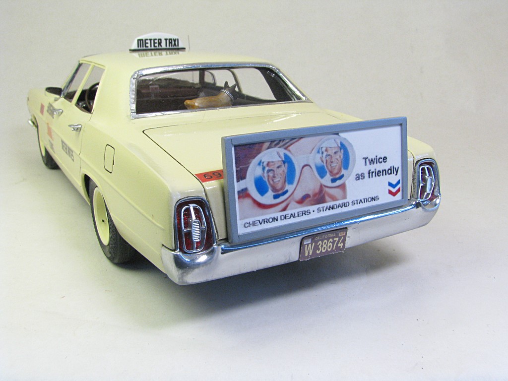 | 1967 Ford Custom 500 taxi (Bullitt movie) This is another addition to the collection of the 'Cars of the movie Bullitt', which was released in 1968. The late Robert Duvall was the taxi driver of this car as he drove Steve McQueen around to various locations in San Francisco. This model grafted the roof of an AMT Ford Interceptor Police Car kit (a 1970 Ford Galaxie 500) onto the body of an AMT Ford Galaxie convertible. The actual car in the movie was a Ford Custom 500, which was sold as fleet vehicles to police departments, taxi compnanies, etc. It differs from the Ford Galaxie in having fewer chrome moldings and a simpler interior. Base Kit(s): AMT 1967 Ford Galaxie (kit number 6117-200) Finished: April 2026 Modifications/Additions: - added roof from Ford Police Car kit and reshaped rear window - rescribed door panel lines to change into a four door - aftermarket window cranks and interior door handles - scratchbult one interior door handle and then resin cast 3 copies - added interior door locks - modified 1:35 scale 3D printed dog for rear window shelf, as per the movie car - BestModelCarParts gauges - added turn signal stalk and gear shifter - scratchbuilt taxi meter with VACANT flag - flocked interior floor - modified police car radio with wound wire for the microphone - modified bench seats from Ford Police car kit - narrowed, headrest and roll pattern removed - custom license plate and bumper sticker to match movie car - rear part of front bumper opened up and running lights added in openeing - headlights from Czech Model Truck Model (https://www.czechtruckmodel.com/) - added radio anttenna - exterior rear view mirror from parts box - scratchbuilt taxi light on roof - exterior door handles from Canuck3D (https://canuck3d.ca/) - photoetch "Custom" script on front quarter panel - scratchbuilt rear advertising sign frame and advertisement taken from billboard photo found on the internet - rear bumper section was removed and strip styrene added to trunk - removed trim on rocker panels - custom printed license plate - all decals from Precision Design Co. (https://www.pdc.ca/rr/catalog) - interior paint is Tamiya acrylic red brown, followed by semi-gloss clear - grill and panel lines have a Tamiya panel line accent black wash - exterior crhome trim is a combination of bare metal foil and Molotow chrome - body paint is Testors Phoenecion yellow, decanted and airbrushed, followed by 1K clear, with some sections polished Click on Thumbnail to see detailed image. These images are 1024 x 768 and maybe a bit slow to load, depending on your connection speed. |