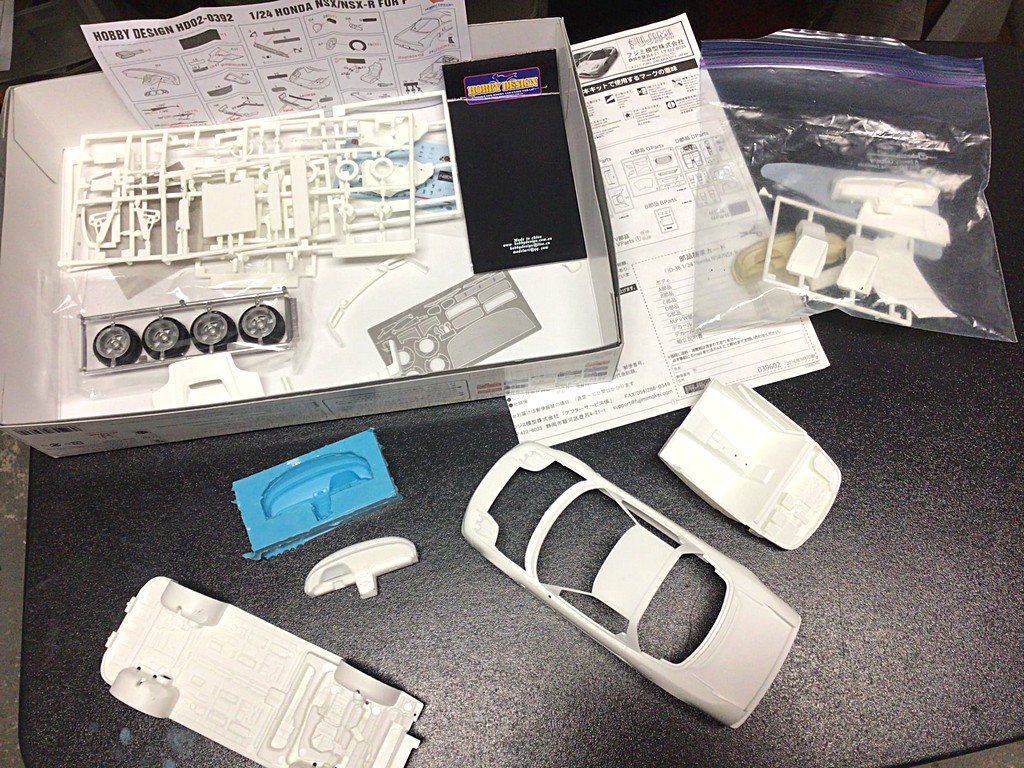 | 2002 Honda NSX- R This model was built during the 15th Annual 24 Model Build and photos were posted on the Facebook album HERE, (they are also shown below) I did some research before doing the build and found that the NSX-R (R for Racing), was a special version of the NSX production car. This 2002 model is based on the second generation NSX, (basically a face lift of the original 1992 car). Honda produced only 140 of the these, only in Japan, only RHD and only in the off white body colour (to hark back to Honda's initial foray into Formula 1, with the RA271 and RA272). They removed about 100 kg out of the production car by removing the audio system, air conditioning, sound insulation and power steering and replacing parts with carbon fiber. There were also some body changes (vented front hood and different rear wing) Anyway, this version allowed the engine to be shown because the solid rear engine cover was replaced with a grill. Unfortunately, the Fujimi kit, being a curbside, just relied on some detail painting (not really matching the real car) in order to take advantage. Most of the Hobby Design photoetch parts were used, which fit very well (and which you can hardly see because they are painted black with black behind them, oh well) Base Kit(s): Fujimi Honda NSX/NSX-R (kit number 03960) Finished: February 2021 Modifications/Additions: - left hand dash resin cast from Tamiya kit - Hobby Design phototch set (grills, seatbelts, pedals) - Chrome metal decals for Honda emblems - red velvet carpeting - paint is a Tamiya racing white laquer (from spray can), LP lacquer for red seats and engine parts, acrylics for the rest Click on Thumbnail to see detailed image. These images are 1024 x 768 and maybe a bit slow to load, depending on your connection speed. Facebook photos, with description |