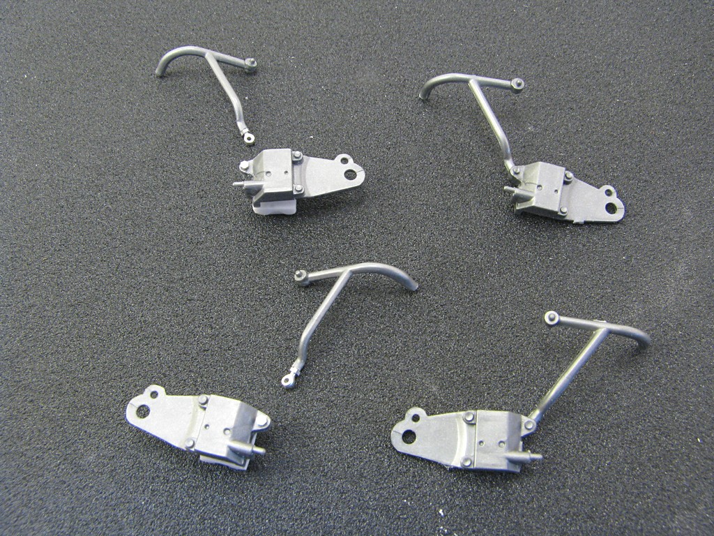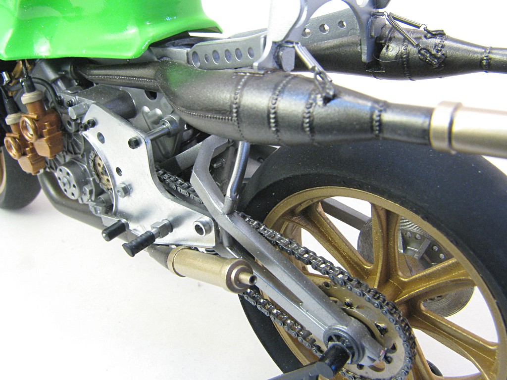 | Kawasaki KR500 GP bike - Eddie Lawson This model was inspired by purchasing a Studio27 decal set designed for both the Kawasaki KR500 and KR100 race bikes ridden by Eddie Lawson. There are numerous photos of the race bike that Eddie rode in 1982. Base Kit(s): Tamiya Kawasaki KR500 (kit number 14028) Finished: Sep 2023 Modifications/Additions: - Front forks replaced with polished aluminum tubing - A mold was made for the backside of the brake calipers and resin cast pieces added to all three - Photoetch faces for brake disks, with scoring grooves added - Exhaust pipes had backs filled in and welds and springs added - Mufflers flange separated from exhaust pipe to allow separate painting - Almost all bolt and screw heads replaced with photoetch or Meng bolt heads and nuts - Hose clamps added to radiator hoses and end fittings to brake lines - 3D printed 7 spoke 16 inch wheels from Falcon Scale Models - 3D printed chainset from Falcon Scale Models - RB Motion rod ends added to front and rear brake supports - Scratchbuilt seats from sheet styrene - Top Studio throttle cable tensioner and fuel lines added to carburetors - Clutch actuator arm added - A few decals from the Studio27 sheet were used - Paint is Tamiya acrylics (all three colours on bodywork), followed by Tamiya acrylic clear, polished and waxed Click on Thumbnail to see detailed image. These images are 1024 x 768 and should load reasonably quickly, depending on your connection speed. |