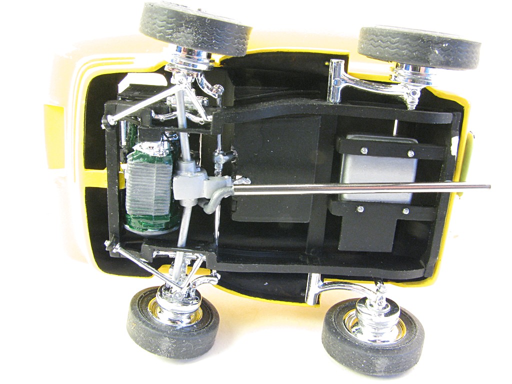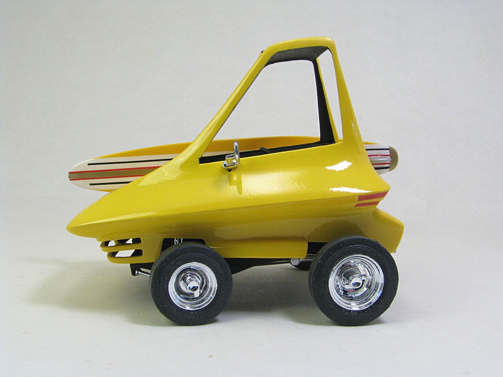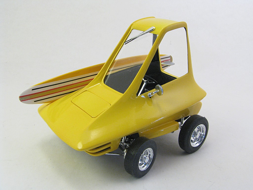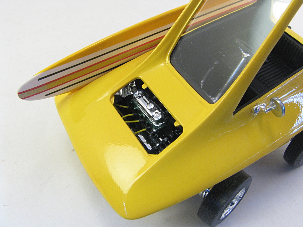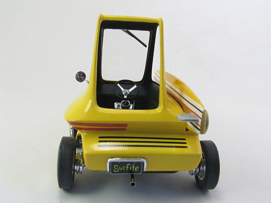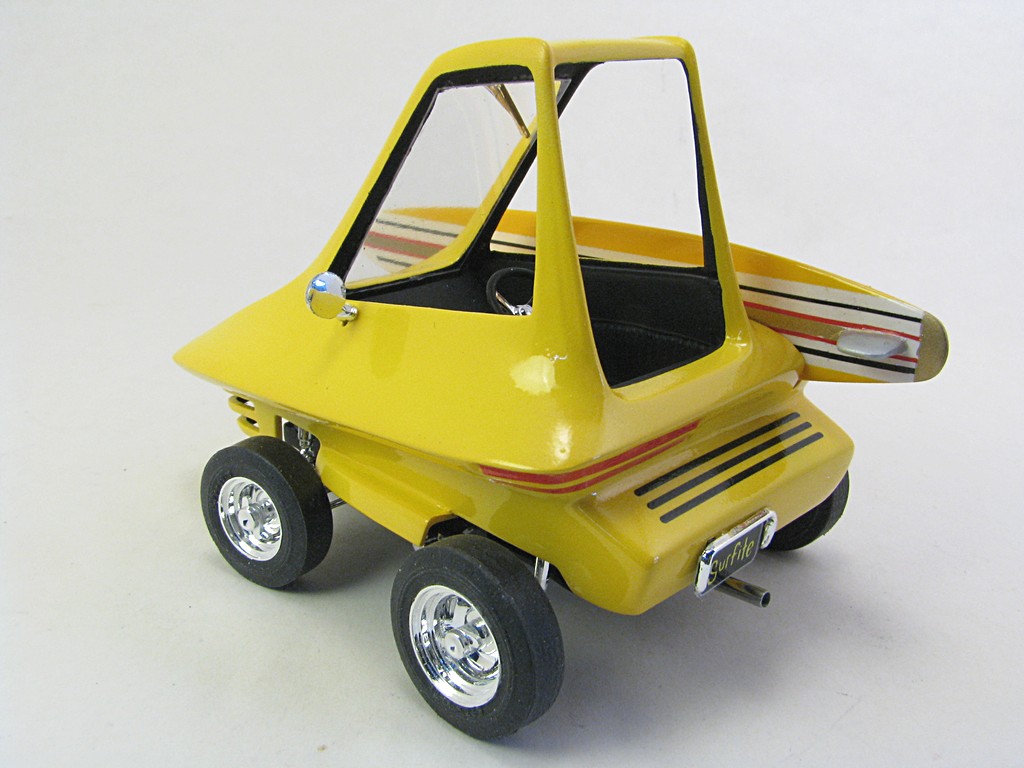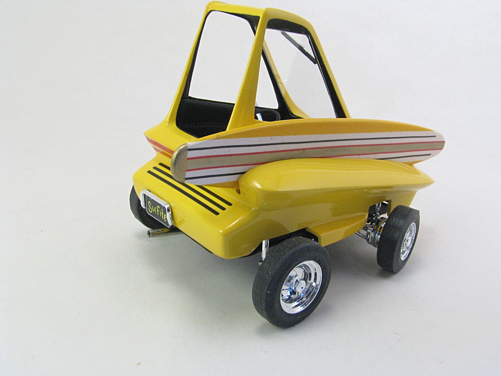| Surfite (Ed 'Big Daddy' Roth) - 1964 This model will be one of a collection of Ed 'Big Daddy' Roth cars and motorcycles. The kit came with a Tiki hut that will eventually be completed. The car was powered by a Mini Cooper engine, making it front wheel drive. The car appeared briefly in the move "Beach Blanket Bingo". Base Kit(s): Revell Surfite with Tiki Hut (kit number 1240) Finished: October 2025 Modifications/Additions: - Poseable steering - Aftermarket gauges, covered with UV clear resin - Adhesive black felt for interior floor - Spark plug wiring added - Opened up slots in front bumper area - Exhaust pipe replaced with stainless steel tubing - Stripes on surfboard are a combination of decals and masking - Paint is Tamiya lemon yellow on body, chrome yellow on surfboard Click on Thumbnail to see detailed image. These images are 1024 x 768 and should load reasonably quickly, depending on your connection speed. |