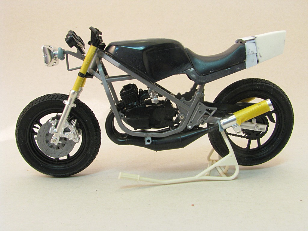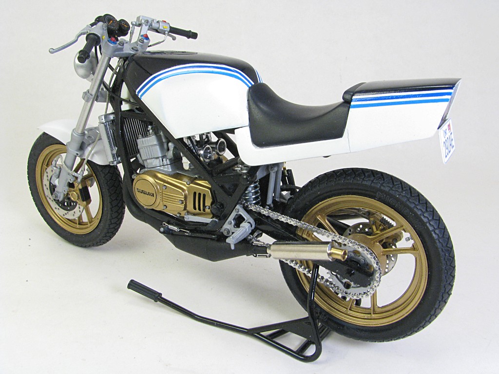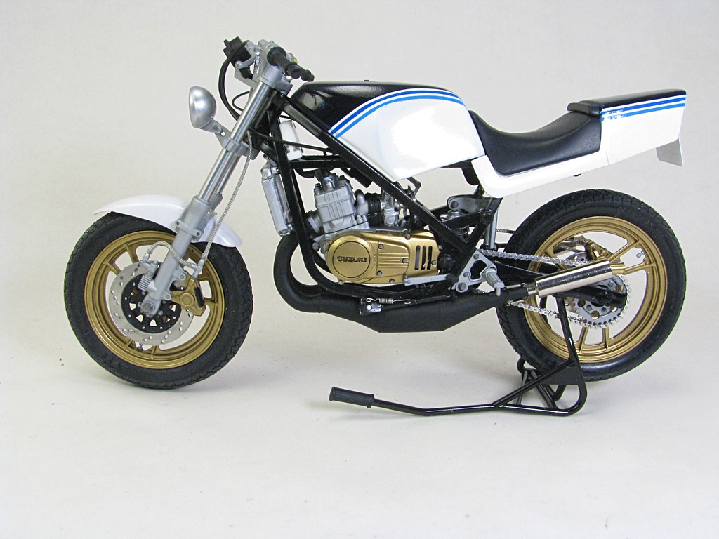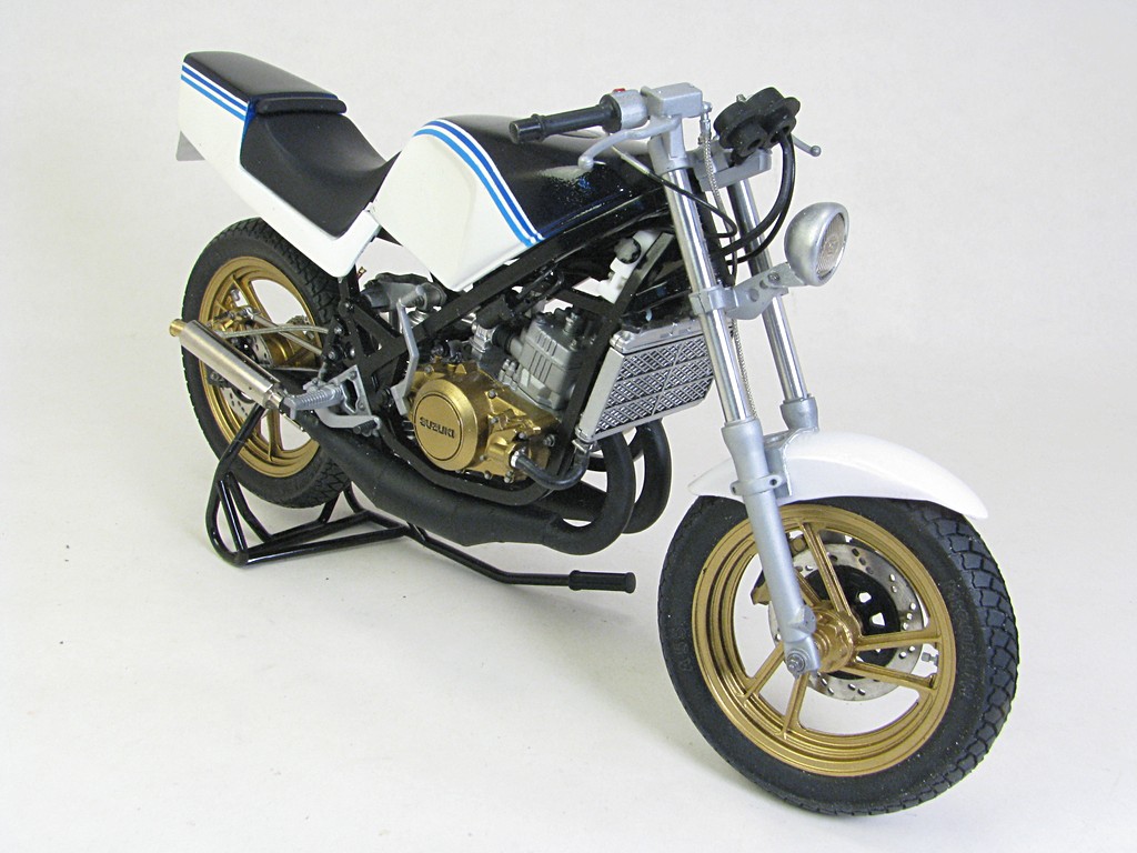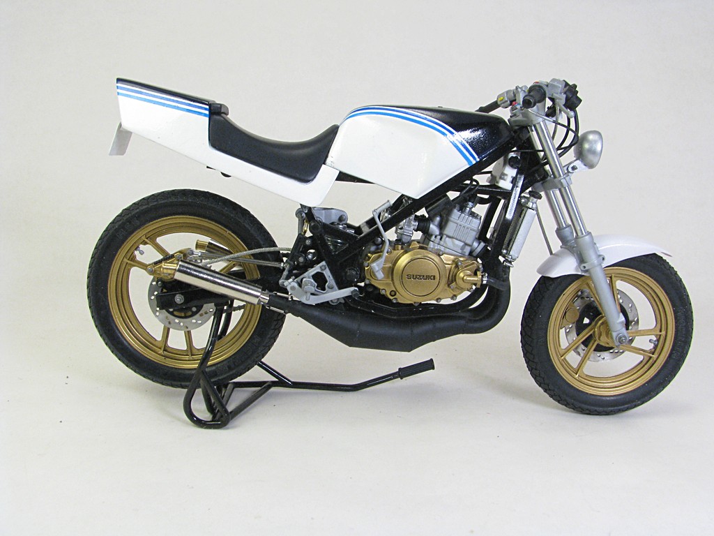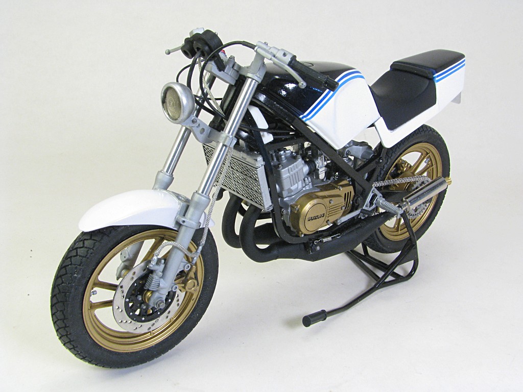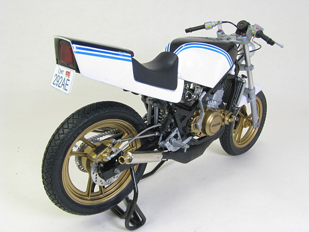 | Suzuki RG250 cafe racer This is the last in a collection of Suzuki RG250 motorcycles, totalling 9 in all (or 13 if the 4 Walter Wolf versions are added. Base Kit(s): Tamiya Suzuki RG250 (kit number 14029) Finished: Dec 2025 Modifications/Additions: - Custom license plate - Added frame strengthening tubes (near steering head and swing arm) - Moved upper radiator hose mount - Brake lines and fittings from Top Studio braided line and resin pieces - Filled in back of exhaust pipes and added Archer Transfers weld 'decals' for joints - Top Studio turned metal mufflers, designed for Hasegawa Honda RS250RW, including exhaust springs - Sidestand spring - Added back of front brake caliper - Filled in back of swingarm and front forks - Photoetched brake disks meant for Hasegawa RG500 - Polished aluminum forks - Scratchbuilt bodywork under seat, blended into rear cowl - 3D printed chainset from Falcon Scale Models - Modified instrument cluster with clear UV resin lenses - Front fender is from RGB500 race bike, modified - Radiator overflow hose added - Meng bolt heads and nuts replaced almost every visible one - Parts box headlight with Czech Truck Model Volvo F12 headlight lens and scratchbuilt mount - Operating chain from Tamiya Honda RC166 detail set - Resin tire valves - Machined metal intake trumpets meant for 1/20 MP4/5 race car - Radiator hose clamps from chrome tape used in nail salons for decorating fingernails - Rear brake rod replaced with RB Motion rod ends and steel tubing - Modified footpeg mounts - New mount for rear brake master cylinder - Top Studio throttle pieces - Concave bucket for taillight created, covered in Bare Metal Foil - Paint is Tamiya TS26 pure white, TS23 light blue, TS15 blue and TS55 dark blue, all decanted and airbrushed, followed by airbrushed Duplicoler 1K clear Click on Thumbnail to see detailed image. These images are 1024 x 768 and should load reasonably quickly, depending on your connection speed. Some construction photos, including various mockups that were tried |
