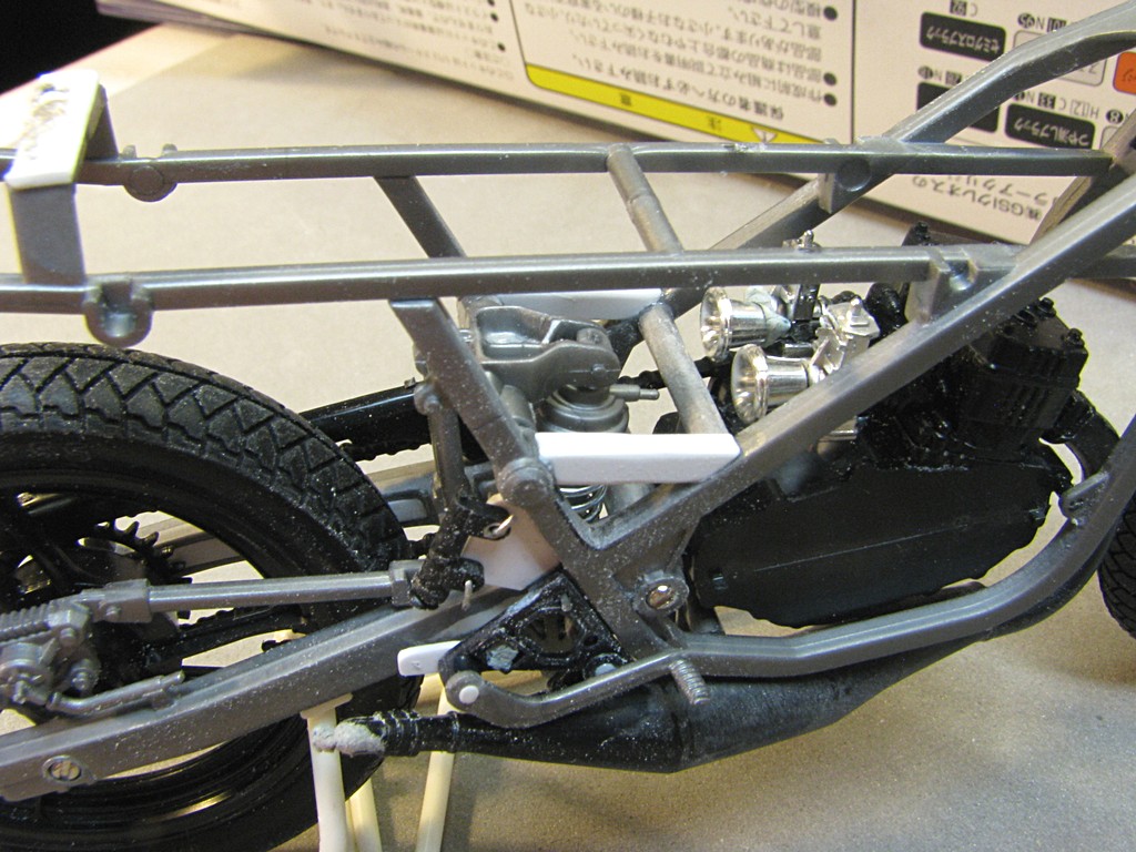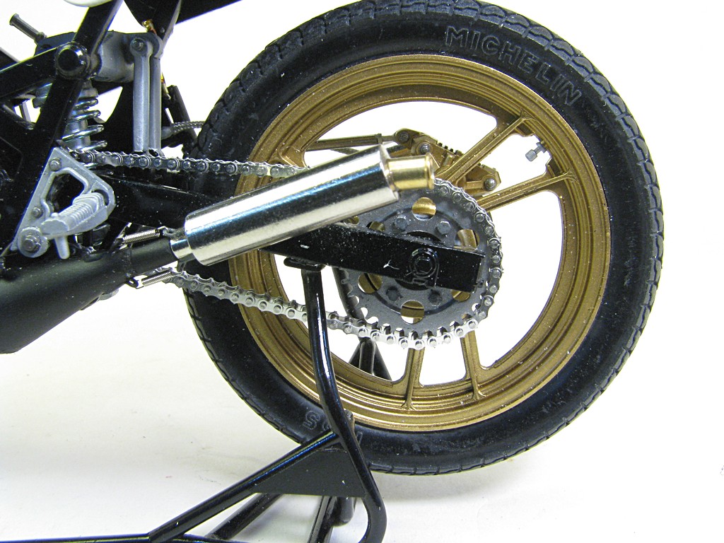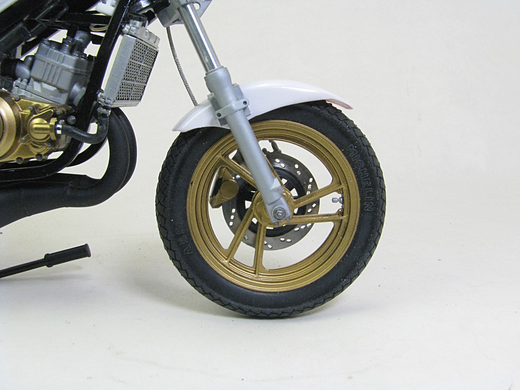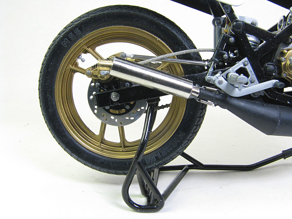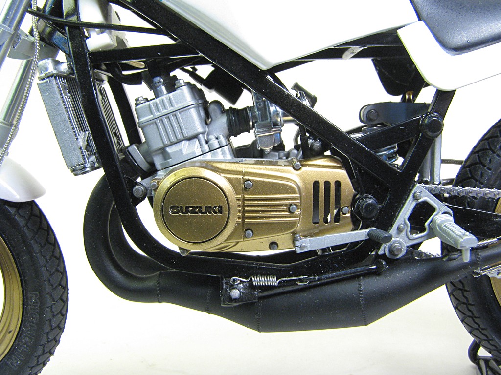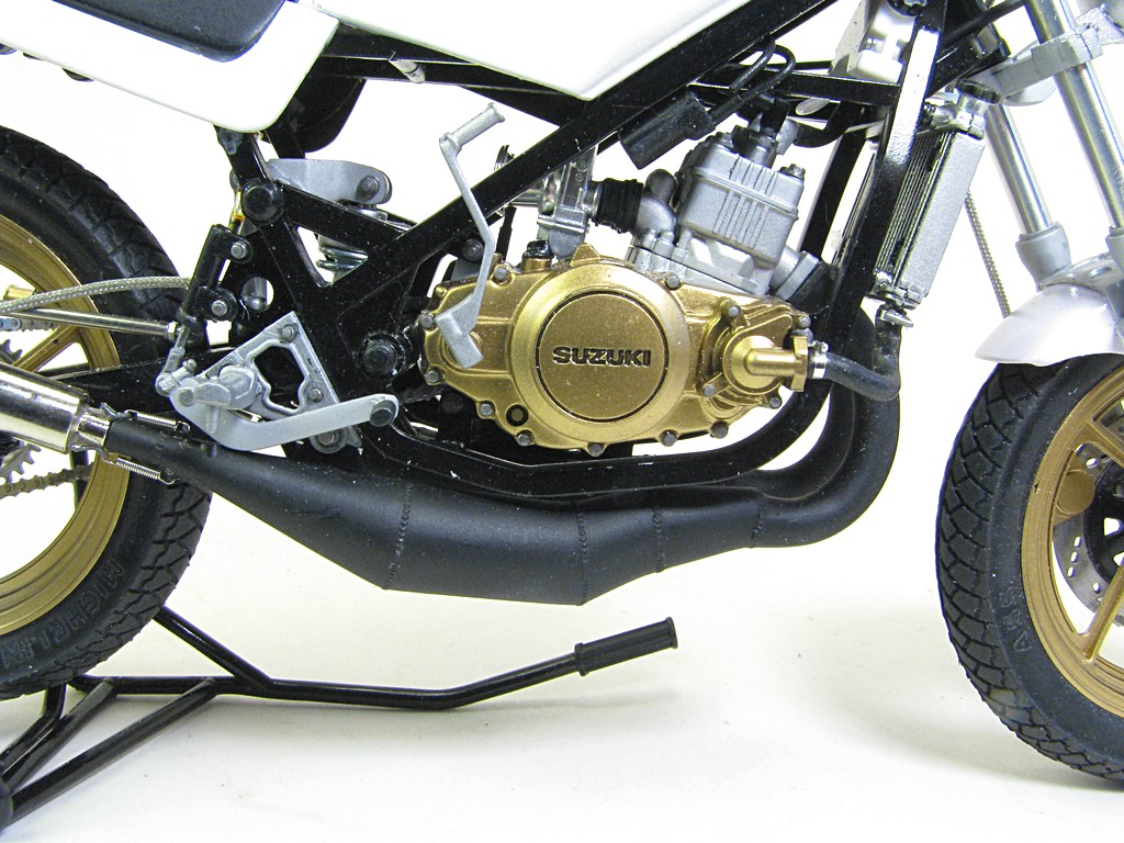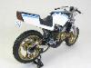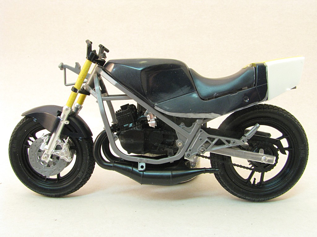| Suzuki RG250 cafe racer This is the last in a collection of Suzuki RG250 motorcycles, totalling 9 in all (or 13 if the 4 Walter Wolf versions are added. Base Kit(s): Tamiya Suzuki RG250 (kit number 14029) Finished: Dec 2025 Modifications/Additions: - Custom license plate - Added frame strengthening tubes (near steering head and swing arm) - Moved upper radiator hose mount - Brake lines and fittings from Top Studio braided line and resin pieces - Filled in back of exhaust pipes and added Archer Transfers weld 'decals' for joints - Top Studio turned metal mufflers, designed for Hasegawa Honda RS250RW, including exhaust springs - Sidestand spring - Added back of front brake caliper - Filled in back of swingarm and front forks - Photoetched brake disks meant for Hasegawa RG500 - Polished aluminum forks - Scratchbuilt bodywork under seat, blended into rear cowl - 3D printed chainset from Falcon Scale Models - Modified instrument cluster with clear UV resin lenses - Front fender is from RGB500 race bike, modified - Radiator overflow hose added - Meng bolt heads and nuts replaced almost every visible one - Parts box headlight with Czech Truck Model Volvo F12 headlight lens and scratchbuilt mount - Operating chain from Tamiya Honda RC166 detail set - Resin tire valves - Machined metal intake trumpets meant for 1/20 MP4/5 race car - Radiator hose clamps from chrome tape used in nail salons for decorating fingernails - Rear brake rod replaced with RB Motion rod ends and steel tubing - Modified footpeg mounts - New mount for rear brake master cylinder - Top Studio throttle pieces - Concave bucket for taillight created, covered in Bare Metal Foil - Paint is Tamiya TS26 pure white, TS23 light blue, TS15 blue and TS55 dark blue, all decanted and airbrushed, followed by airbrushed Duplicoler 1K clear Click on Thumbnail to see detailed image. These images are 1024 x 768 and should load reasonably quickly, depending on your connection speed. Some construction photos, including various mockups that were tried |