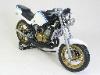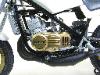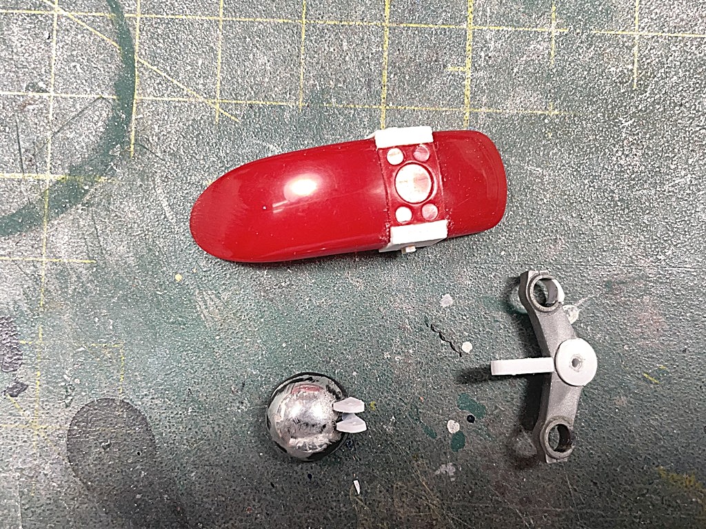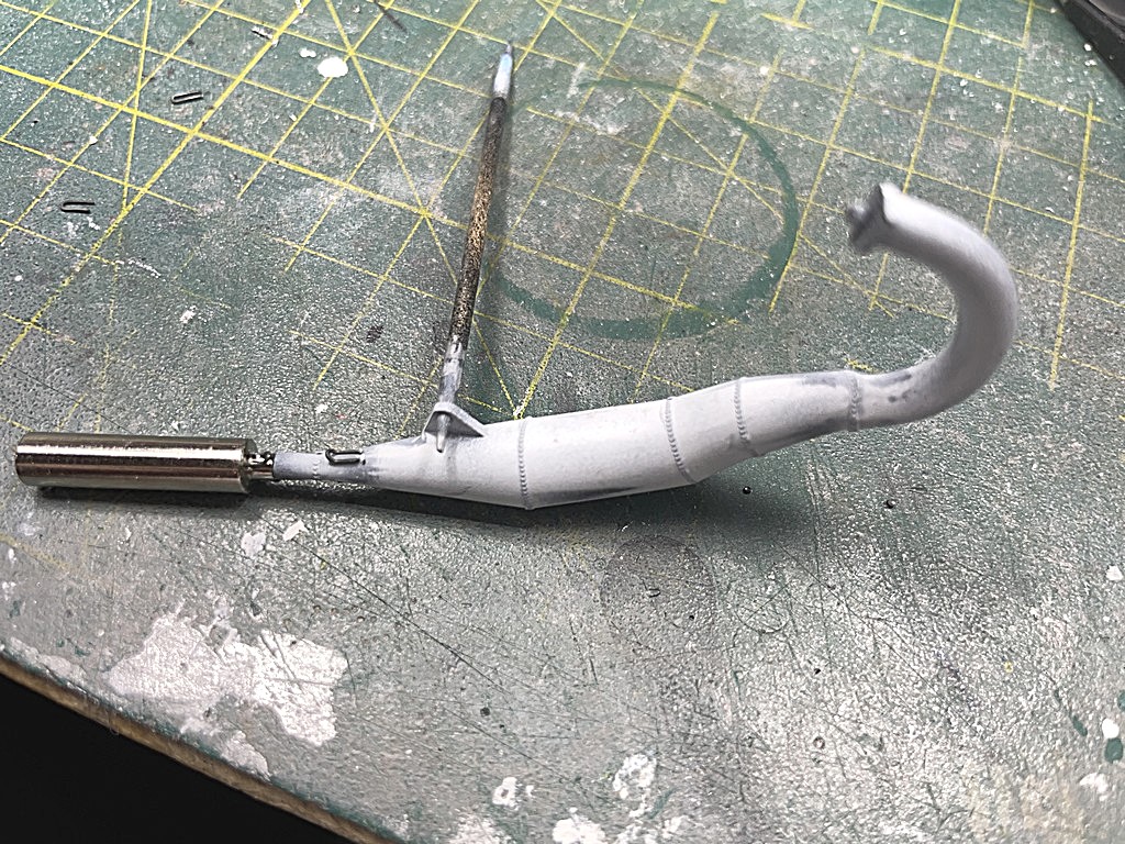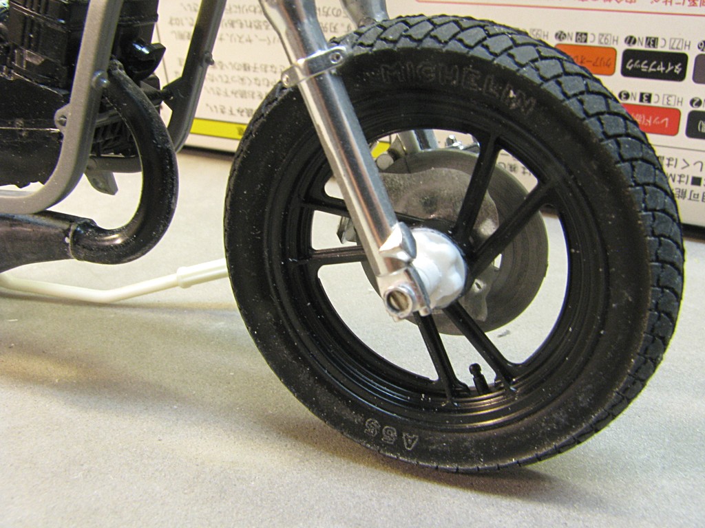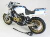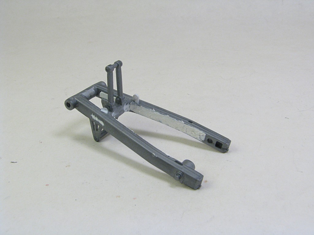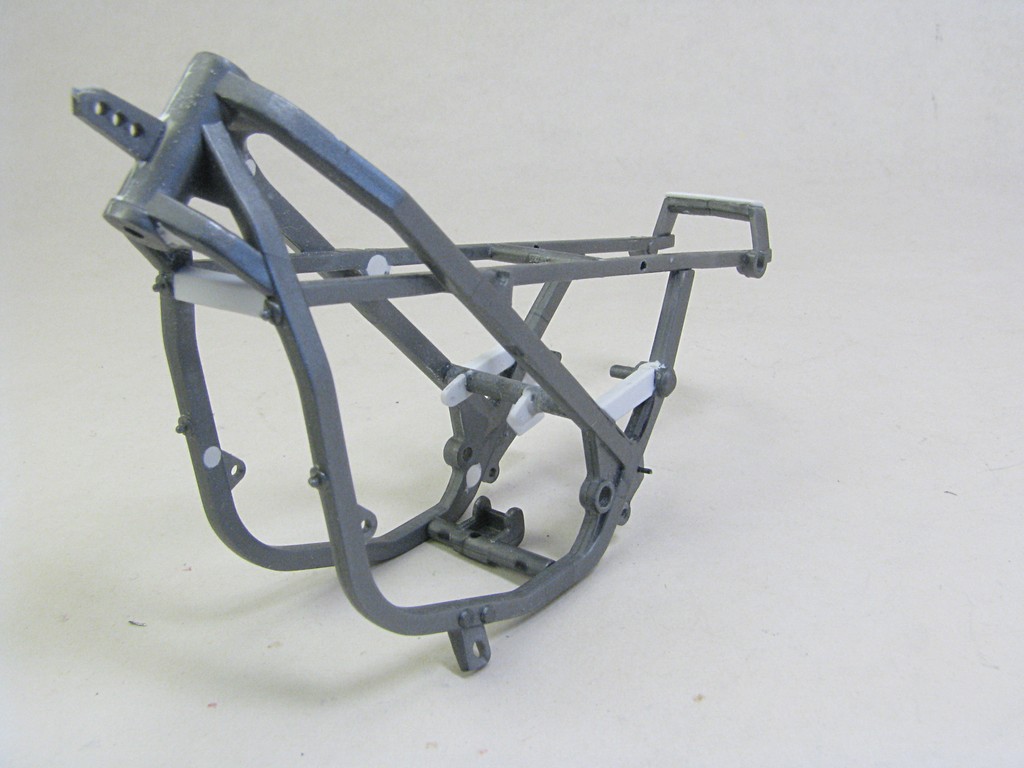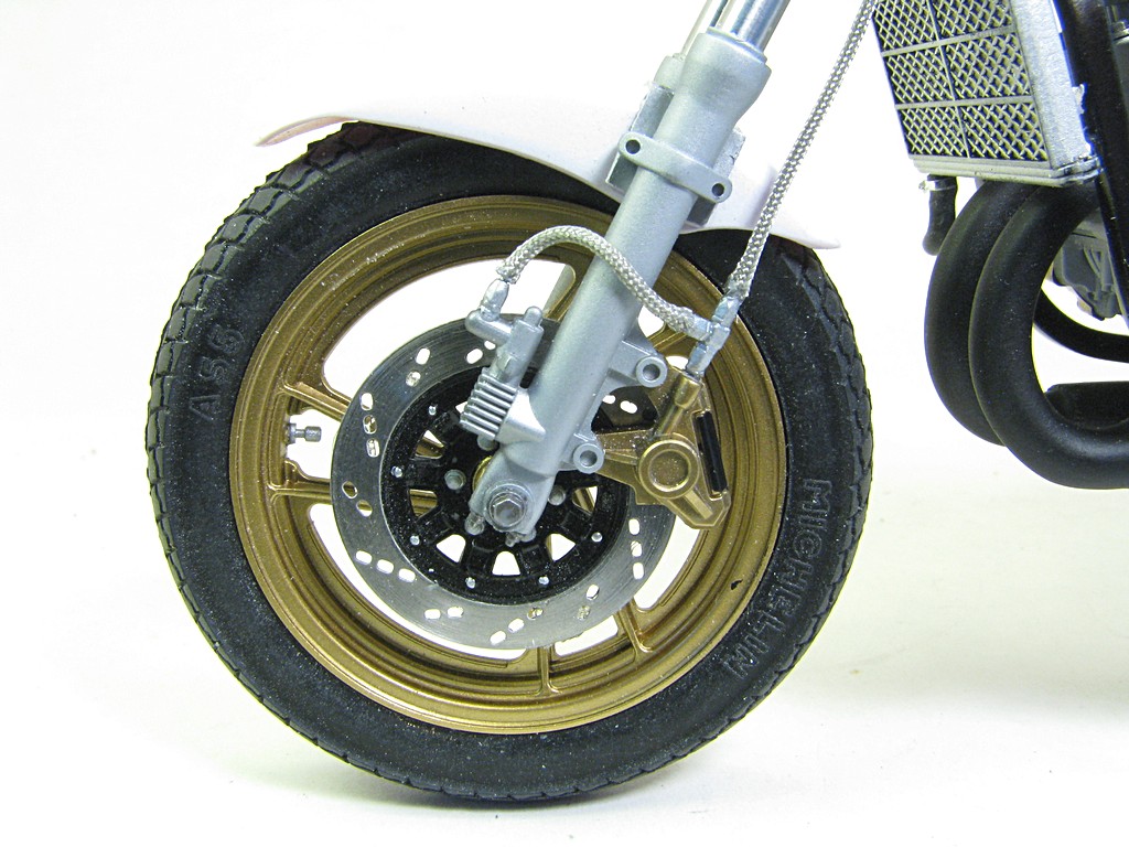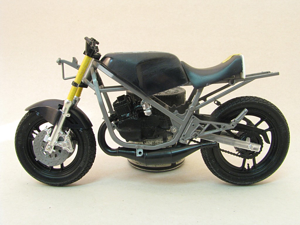 | Suzuki RG250 cafe racer This is the last in a collection of Suzuki RG250 motorcycles, totalling 9 in all (or 13 if the 4 Walter Wolf versions are added. Base Kit(s): Tamiya Suzuki RG250 (kit number 14029) Finished: Dec 2025 Modifications/Additions: - Custom license plate - Added frame strengthening tubes (near steering head and swing arm) - Moved upper radiator hose mount - Brake lines and fittings from Top Studio braided line and resin pieces - Filled in back of exhaust pipes and added Archer Transfers weld 'decals' for joints - Top Studio turned metal mufflers, designed for Hasegawa Honda RS250RW, including exhaust springs - Sidestand spring - Added back of front brake caliper - Filled in back of swingarm and front forks - Photoetched brake disks meant for Hasegawa RG500 - Polished aluminum forks - Scratchbuilt bodywork under seat, blended into rear cowl - 3D printed chainset from Falcon Scale Models - Modified instrument cluster with clear UV resin lenses - Front fender is from RGB500 race bike, modified - Radiator overflow hose added - Meng bolt heads and nuts replaced almost every visible one - Parts box headlight with Czech Truck Model Volvo F12 headlight lens and scratchbuilt mount - Operating chain from Tamiya Honda RC166 detail set - Resin tire valves - Machined metal intake trumpets meant for 1/20 MP4/5 race car - Radiator hose clamps from chrome tape used in nail salons for decorating fingernails - Rear brake rod replaced with RB Motion rod ends and steel tubing - Modified footpeg mounts - New mount for rear brake master cylinder - Top Studio throttle pieces - Concave bucket for taillight created, covered in Bare Metal Foil - Paint is Tamiya TS26 pure white, TS23 light blue, TS15 blue and TS55 dark blue, all decanted and airbrushed, followed by airbrushed Duplicoler 1K clear Click on Thumbnail to see detailed image. These images are 1024 x 768 and should load reasonably quickly, depending on your connection speed. Some construction photos, including various mockups that were tried |