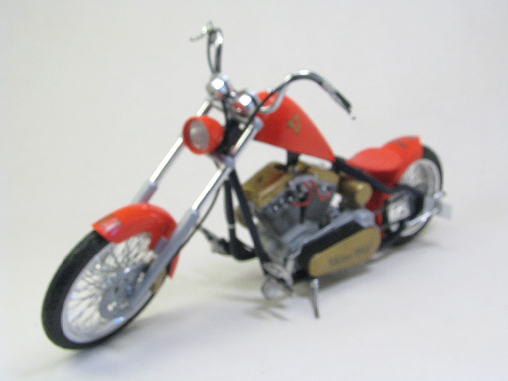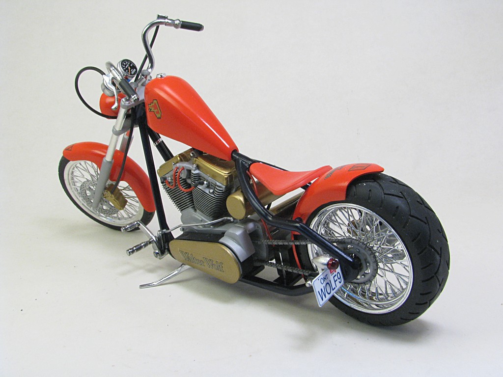 | Walter Wolf Chopper This model started as a built up kit that was given to me at the 2026 Motorcycle Supershow. The idea was to disassemble, strip the paint and rebuild the model during the 2026 24 hour build challenge. Alas, the model was not completed by the 24 hour deadline and the Testor's Chrom Spray paint, that was airbrished, needed to be stripped and done with Alclad chrome. Base Kit(s): Revell-Monogram "Crusader" chopper (kit number 7314) Finished: February 2026 Modifications/Additions: - control cables (clutch and brakes) and gear shift rod - battery wiring - oil lines - spark plugs and wires - rear brake caliper, removed and remounted so that it was close to the disk - 3D printed chainset from Falcon Scale Models (meant for Yamaha YZR-M1) - most frame bolt heads replaced with Meng versions - custom license plate - instrument cluster (from parts box) and gauges - remove bolt heads and replace with Meng pieces - decals from Tamiya Walter Wolf RG250 -- paint is decanted Tamiya TS-55 dark blue (frame) LP bright red (bodywork) TS-31 gold, LP flat aluminum on engine parts, Alclad chrome over LP gloss black (chrome parts) Click on Thumbnail to see detailed image. These images are 1024 x 768 and should load reasonably quickly, depending on your connection speed. |